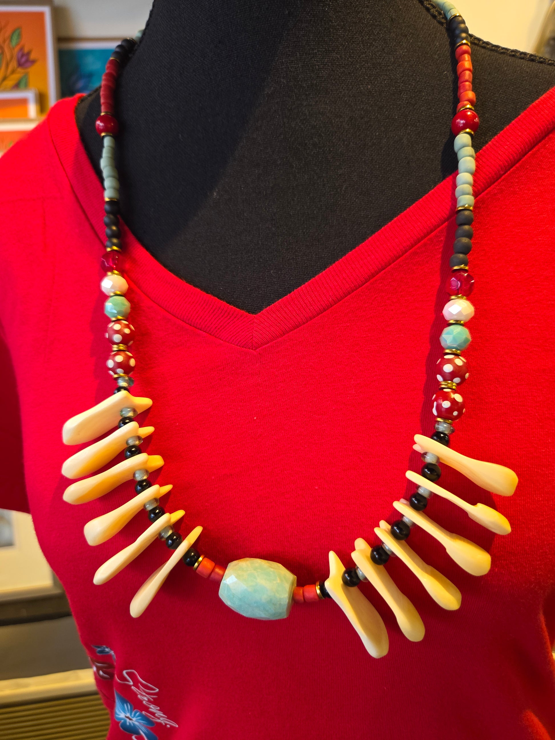 This handcrafted piece features Amazonite paired with red replica matte skunk trade beads and imitation elk teeth made from bone. The design is detailed with coral, Java beads, and Gooseberry beads.