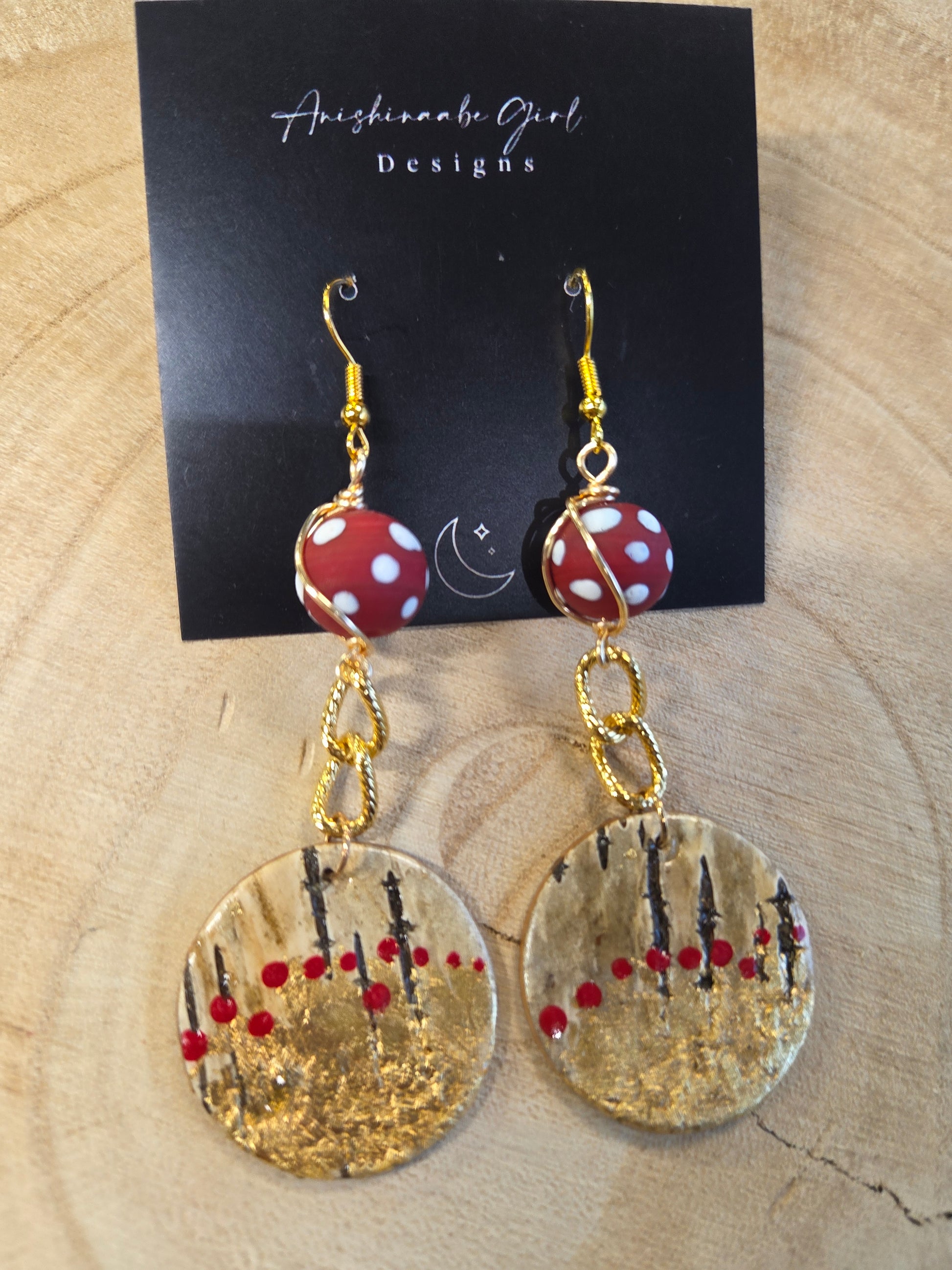 An incredible and unforgettable design. These earrings feature a striking matte red skunk replica trade bead, meticulously wire-wrapped and accented by golden gilding and an exquisite golden chain that provides the perfect finishing detail.
