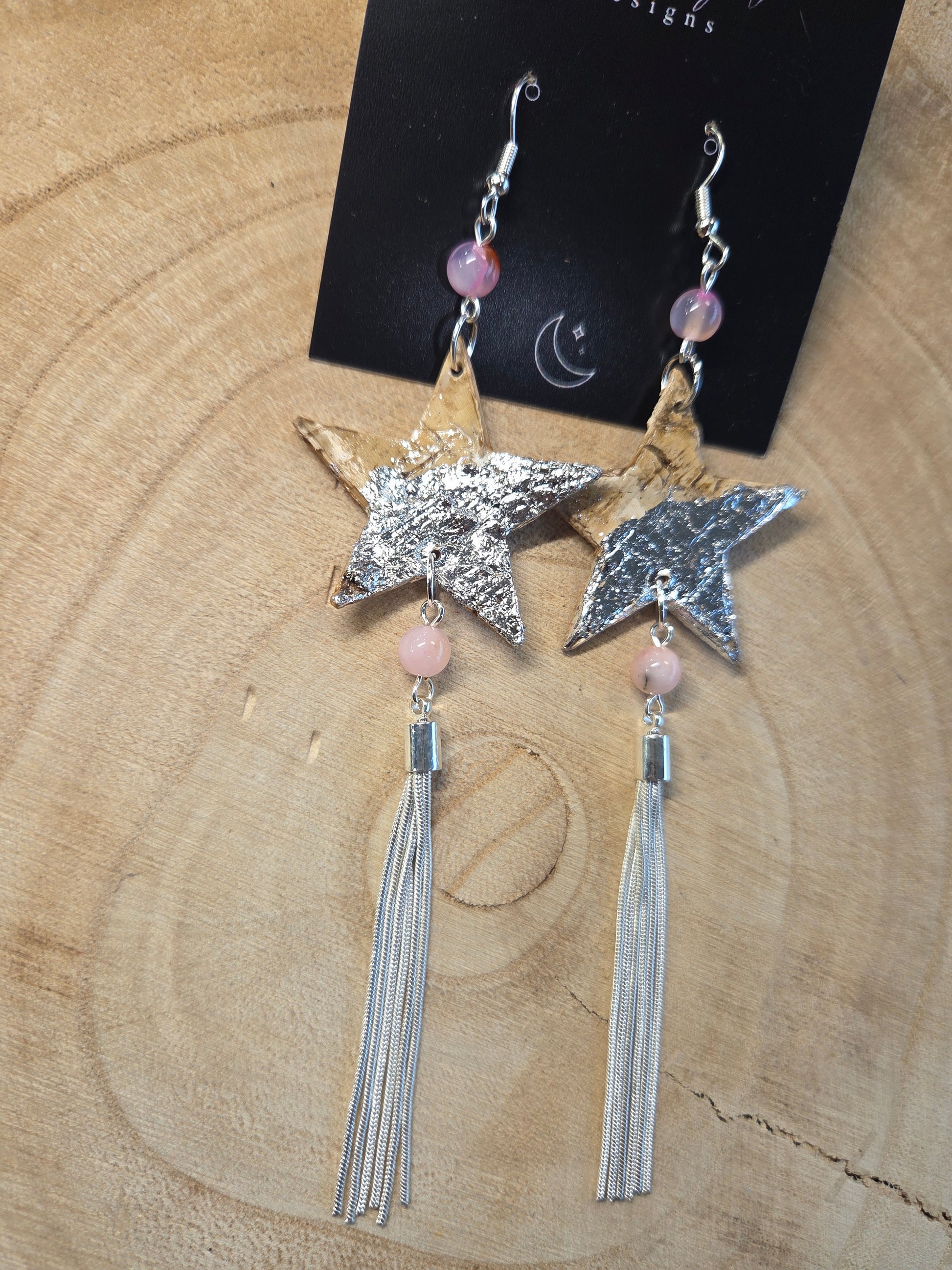 Inspired by the Star People creation story, this luxurious statement design shimmers with silver and subtle pink light. Featuring birch bark, a flowing silver chain tassel, and pink gemstones, this piece evokes the delicate beauty of the Skyworld connection.