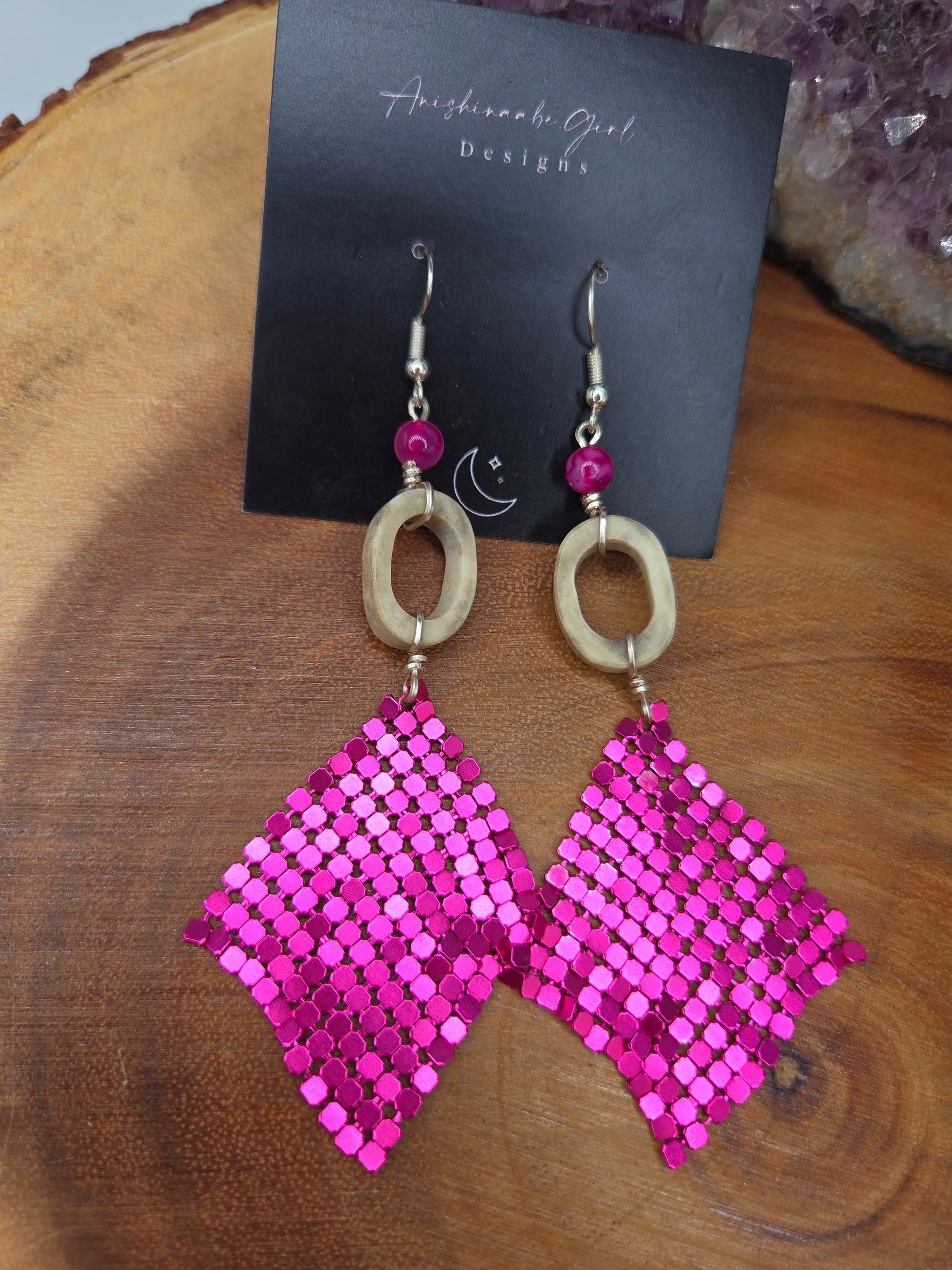 - Carved Caribou Antler Earrings with electric pink chandelier mesh and agate