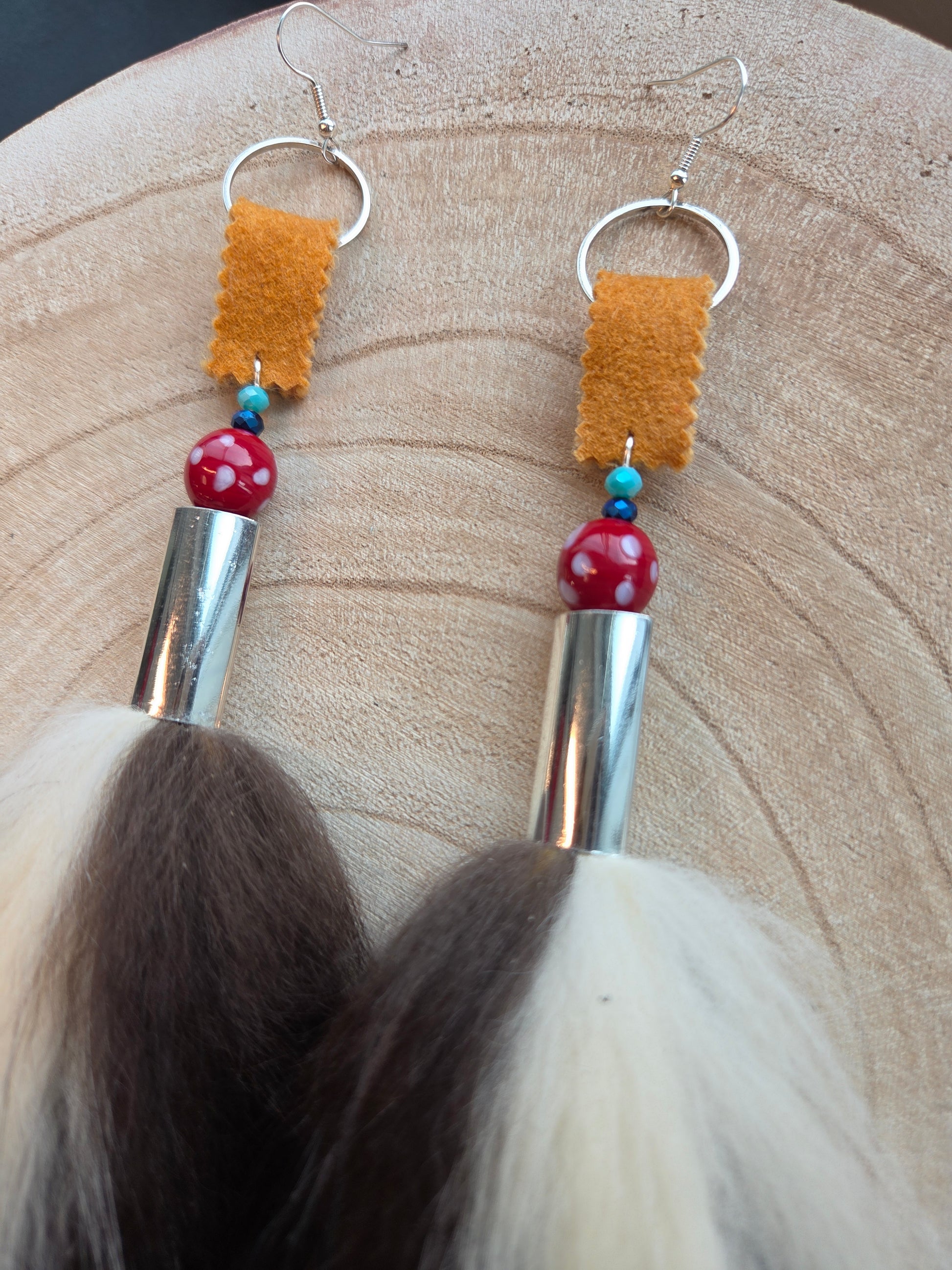 These earrings beautifully blend traditional, grounded materials with vibrant colour, embodying the strong, confident protection of the Skunk Medicine alongside the wisdom associated with blue and turquoise.