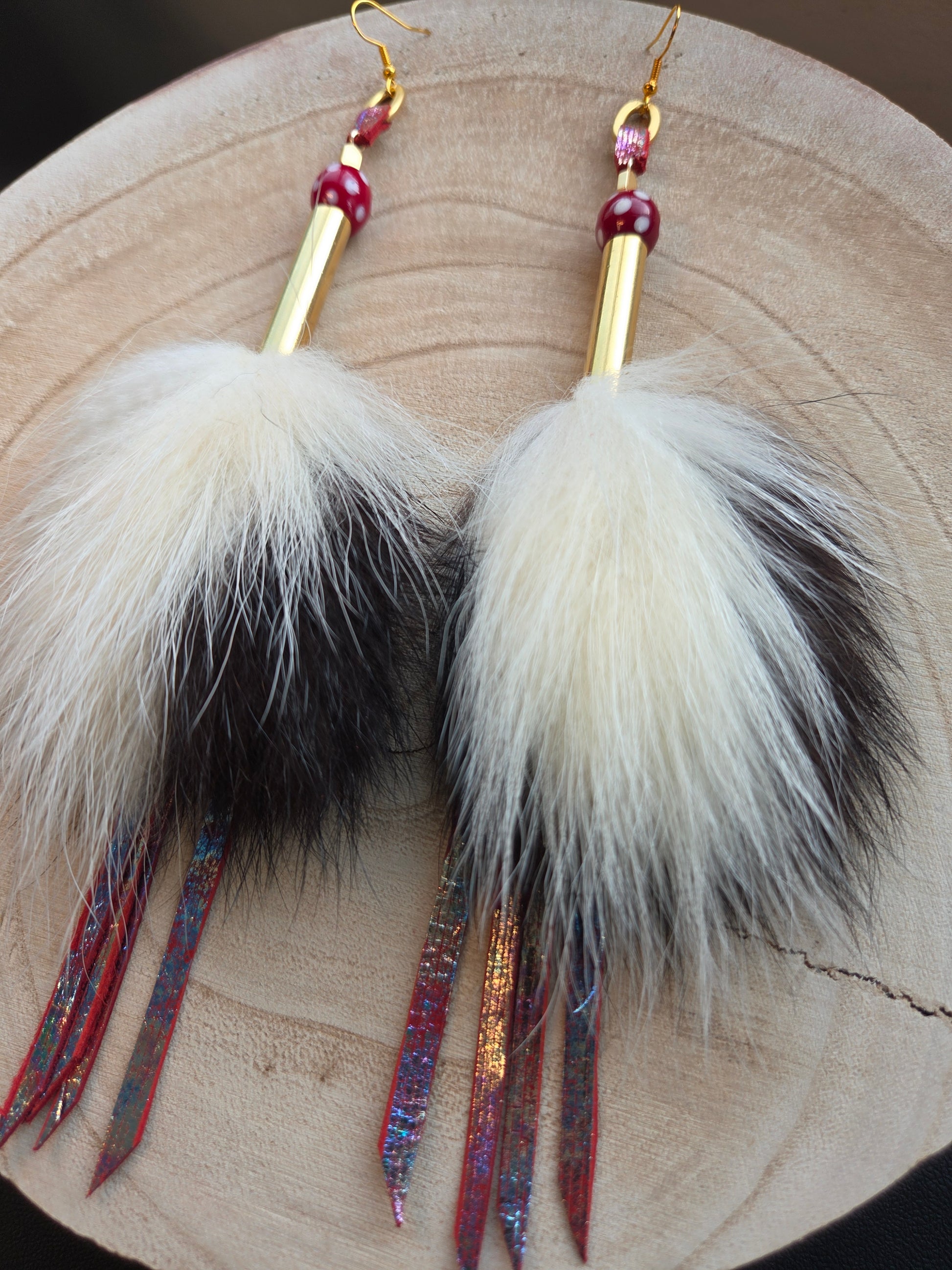 - Materials: Intricately crafted skunk charm, glossy red replica skunk trade beads, and rich, red metallic leather cut into dynamic tassels. Finished with gold-plated wire and earring hooks.