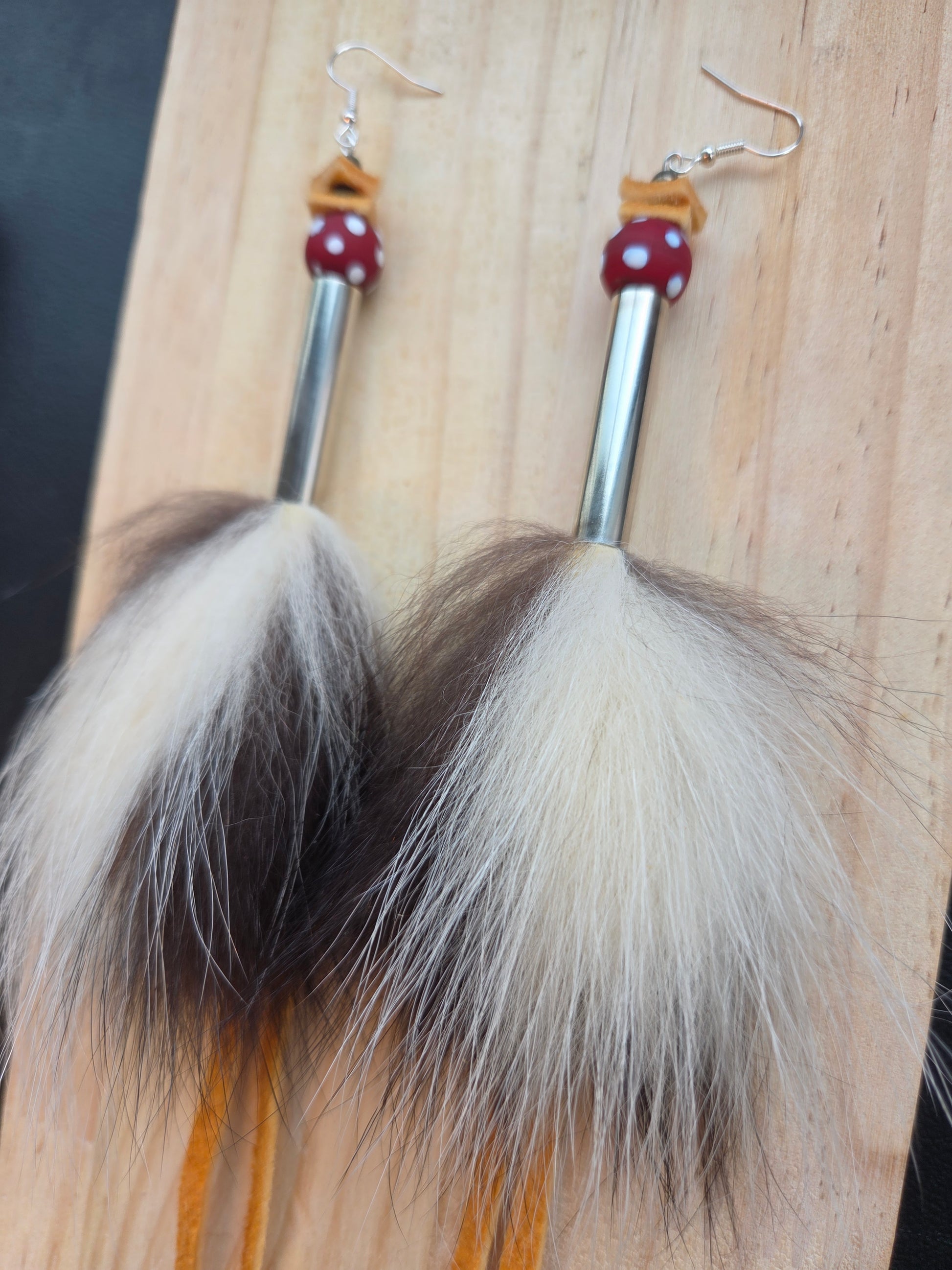 - Materials: Intricately crafted skunk charm, dramatic tassels made from soft, luxurious smoked moosehide, grounding Hematite beads (known for protection and stability), glossy red replica skunk trade beads, and elegant silver-plated tubing. Finished with silver-plated wire and hooks.