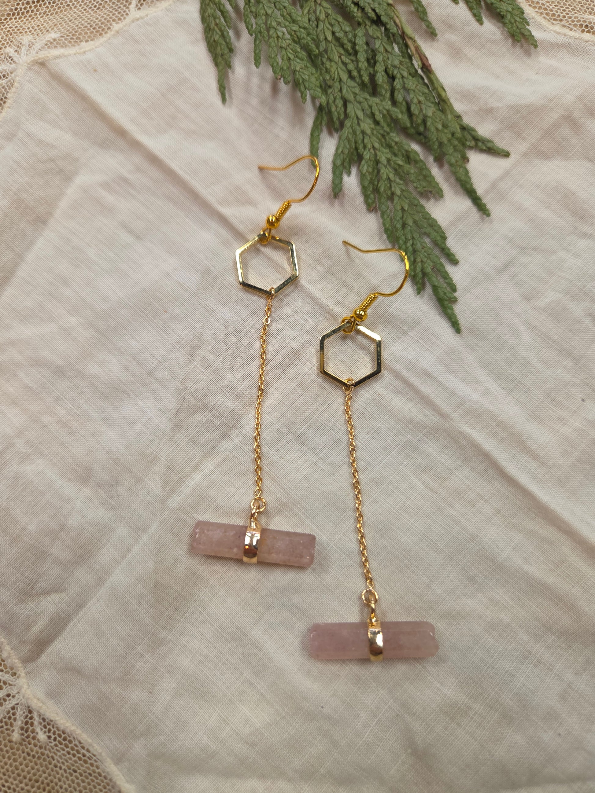 - Hexagon Charm Drops earrings with strawberry quartz charms