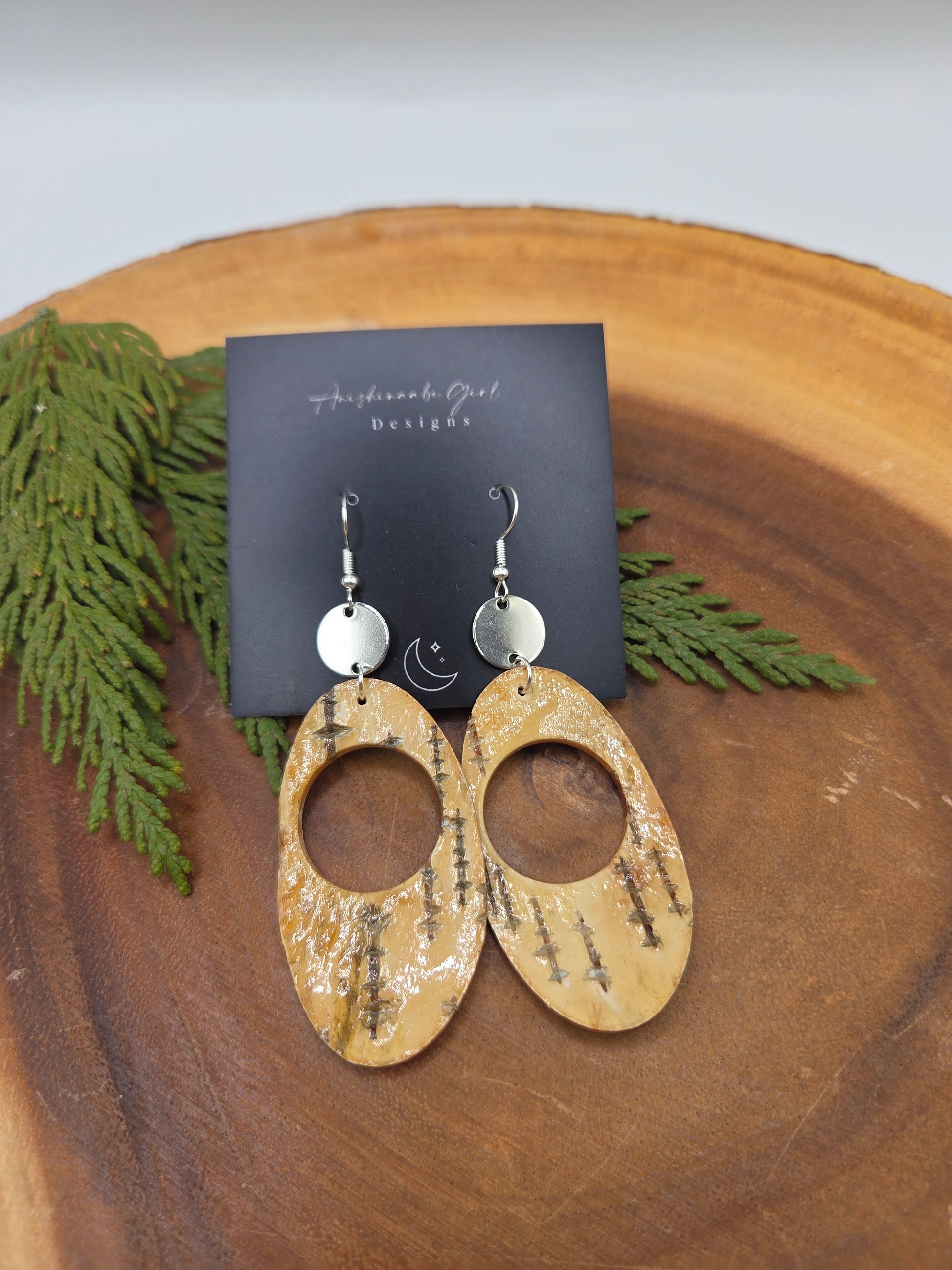 Simple Birchbark Earrings in oval shape with cutout designs, glossy finish, handcut