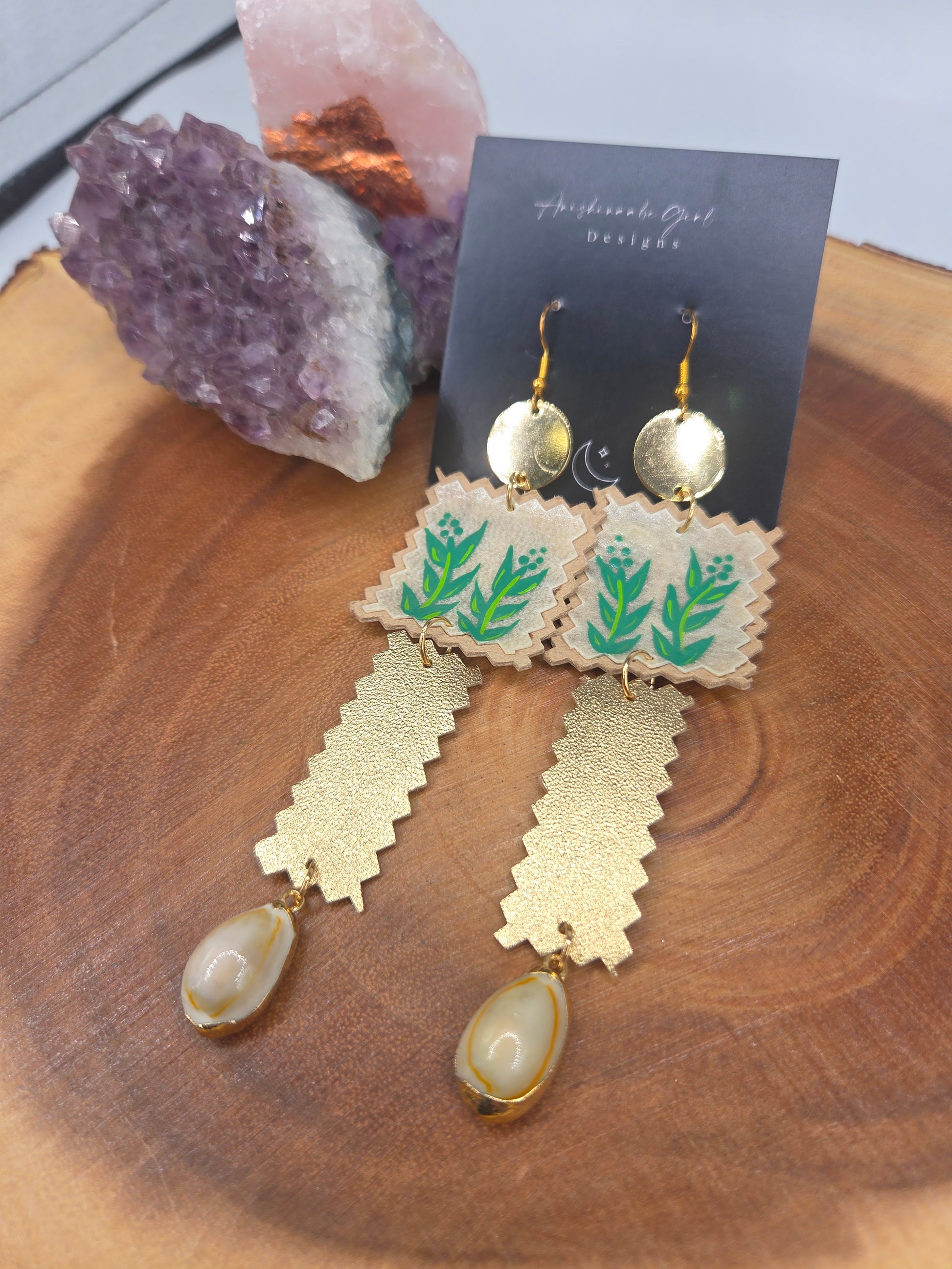- Sage Handpainted parfleche earrings on metallic gold leather and cowrie shell drops